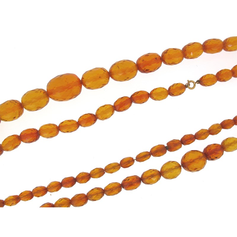 A graduated and faceted amber bead necklace, 92cm long. And another smaller but similar amber bead necklace.