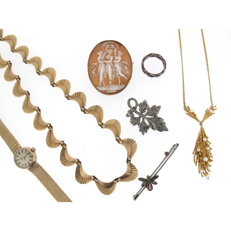 A lady's 9ct gold wristwatch by Certina with a 9ct integrated yellow gold band, a yellow gold scroll link necklace and a yellow gold pendant set with cultured pearls on a fine link yellow gold chain. 25g (2)