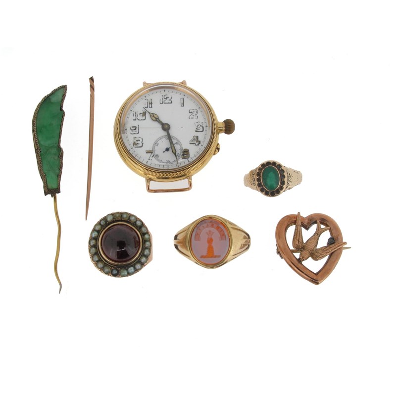 A gold wristwatch, white enamel dial with Arabic numerals with three rings and two brooches.