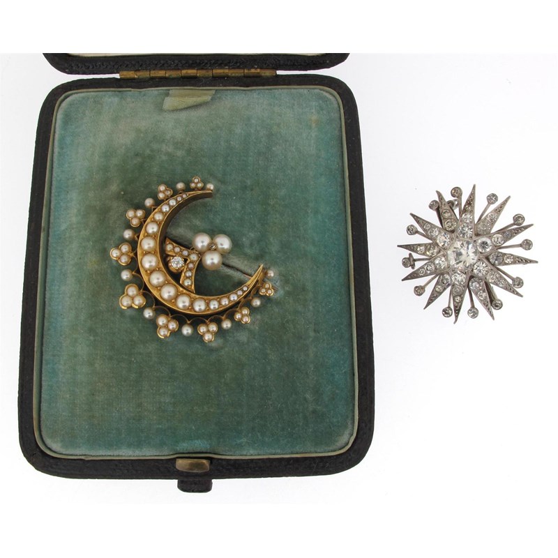 An Edwardian gold crescent brooch, graduated seed pearls and two small diamonds. And a paste set star brooch.
