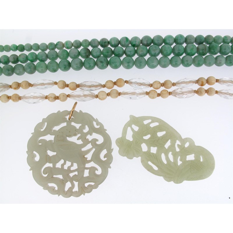 A long necklace mounted with ivory and faceted rock crystal beads with silk tassel, 130cm. A three row graduated green bead necklace and two carved and pierced hard stone pendants.