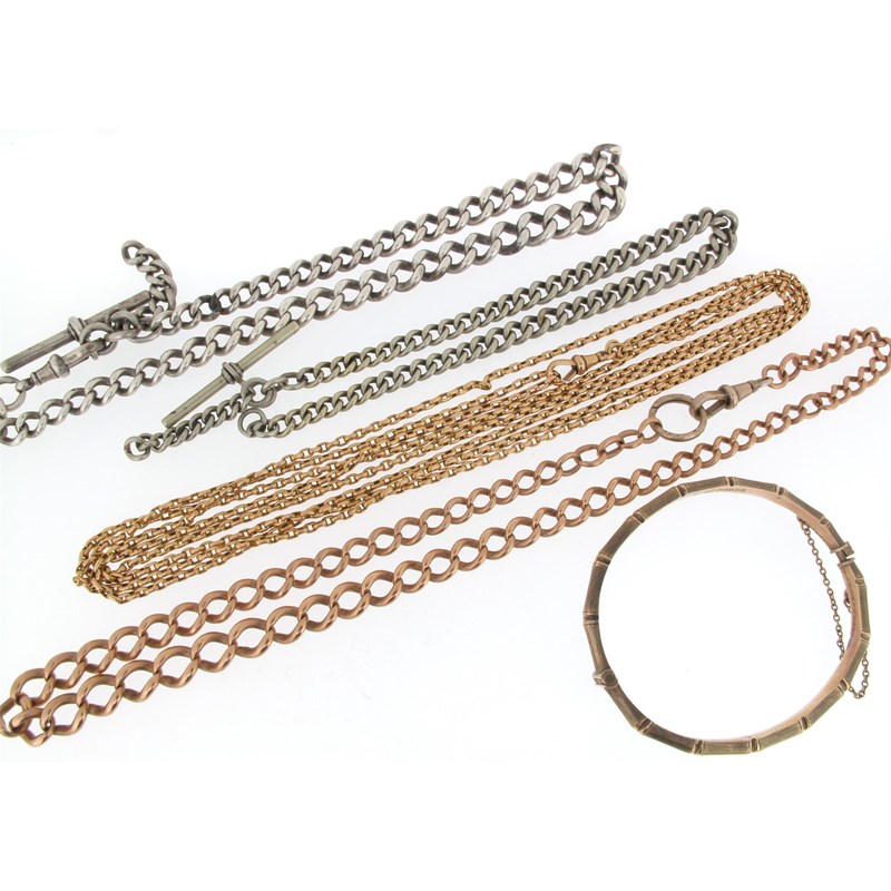 A graduated 9ct gold curb link watch chain, 46cm. 35g. A gold long guard chain 156cm, 26g. A gold bamboo form hinged bangle, a silver graduated curb link watch chain and another watch chain.