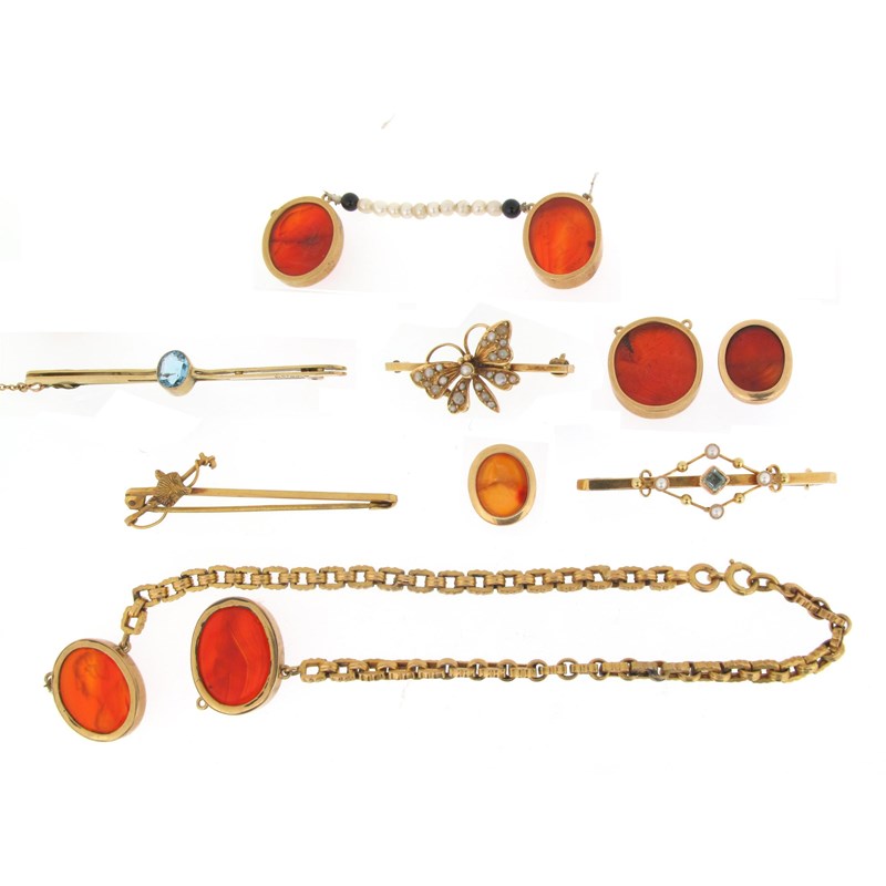 Seven carved carnelean portrait intaglios, mounted in gold, with four gold bar brooches with a section of gold chain.
