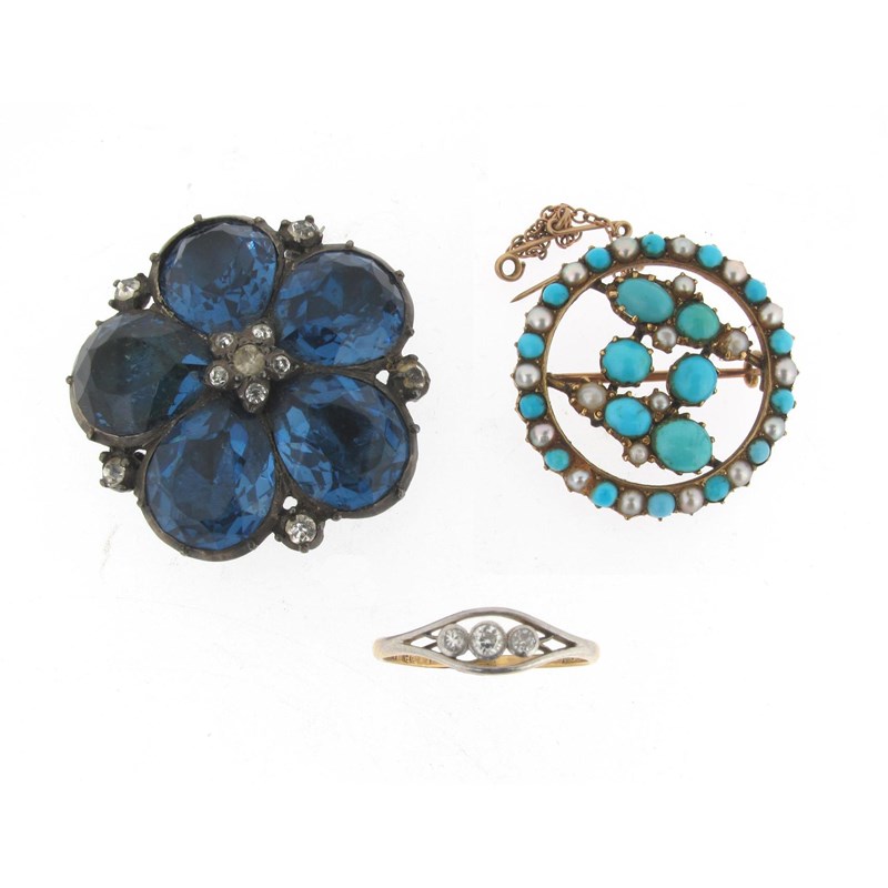 A circular gold brooch set with pearls and turquoise cabochons, a gold ring set with three small circular cut diamonds and a brooch set with blue and white stones.