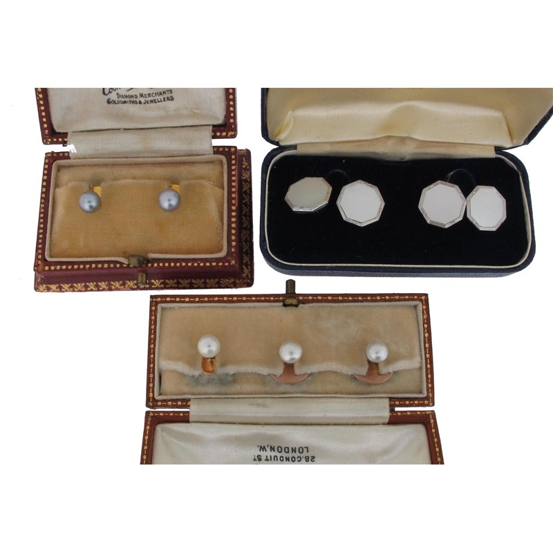 A pair of shell mounted eight sided 9ct white gold dress cuff links, and two cased sets of three and two pearl mounted gold dress studs.