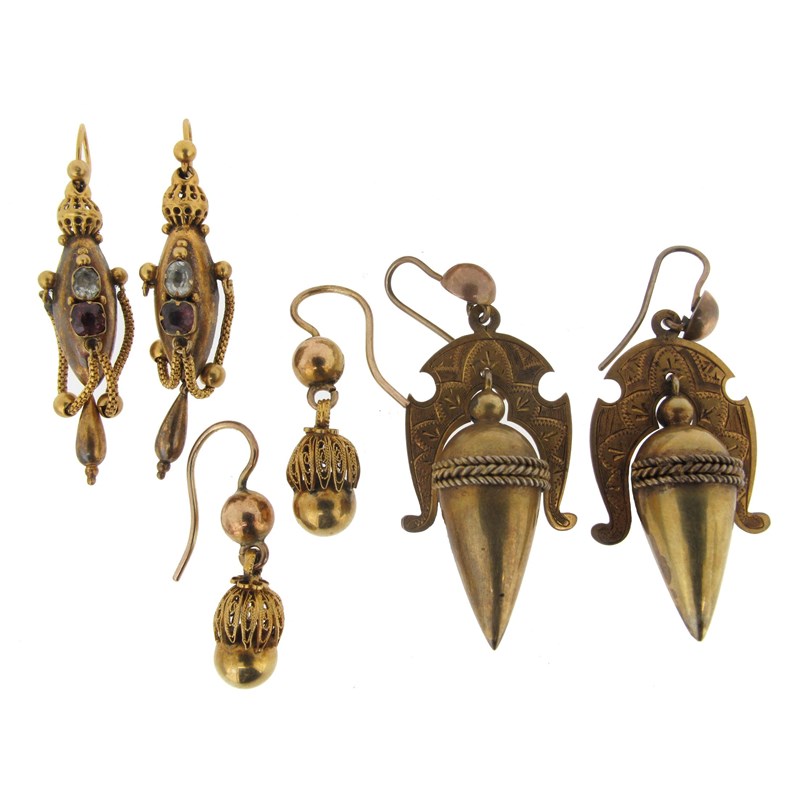 A pair of Victorian gold amphora style drop earrings, a pair of Victorian gold drop earrings each set with two stones and fine chain festoons and a pair of Victorian gold cannetille drop earrings.