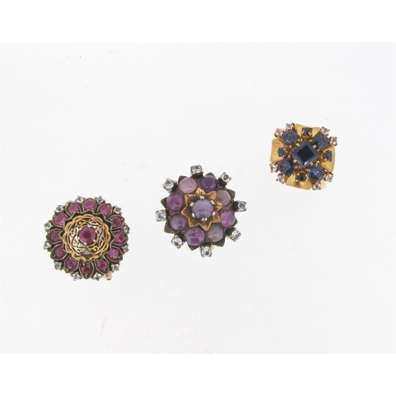 A sapphire and diamond set gold cluster ring, a ruby and white stone set gold cluster ring. And a star sapphire and white stone set gold cluster ring. 22g in total.