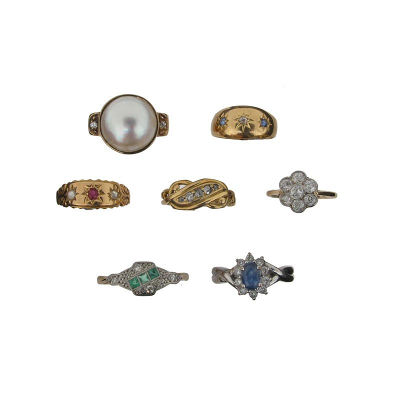 A diamond cluster ring, set with seven circular cut diamonds in gold. And six assorted gold rings set with various diamonds, gem stones etc.