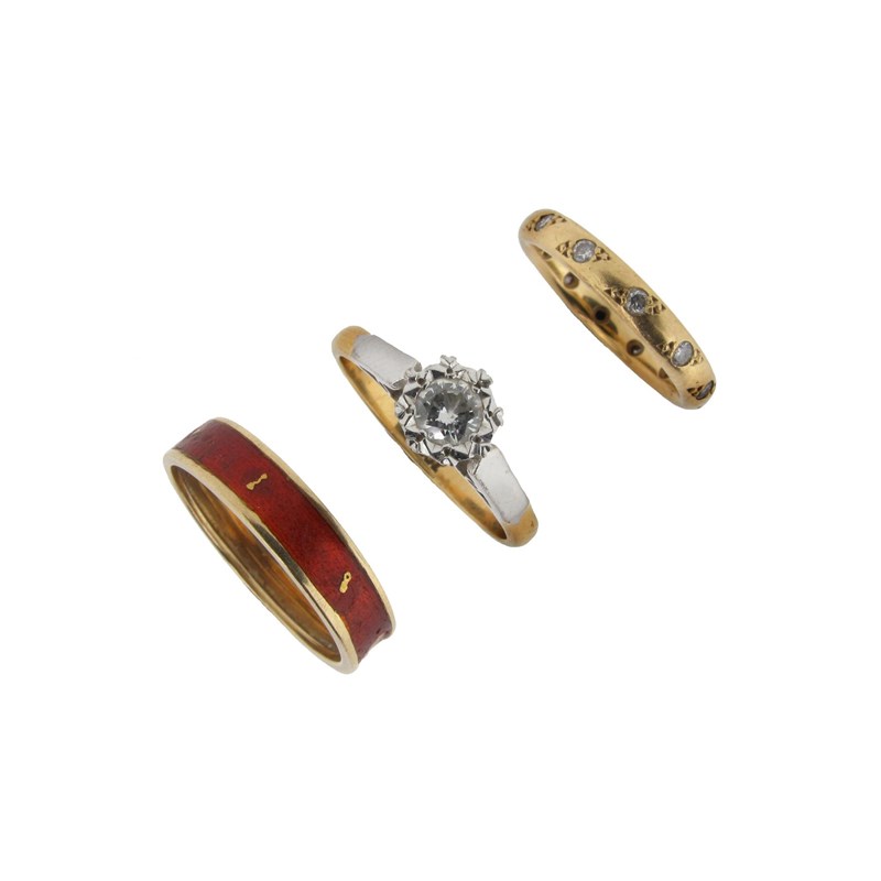 A diamond solitaire ring, set in yellow and white gold. A gold ring with damaged red enamel decoration and a gold eternity ring set with small circular cut diamonds.