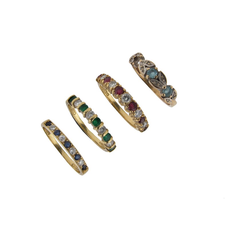 Four assorted diamond and gem stone set gold rings
