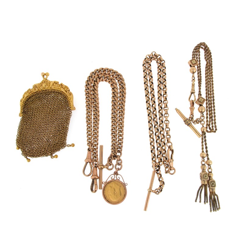 A small gold mesh purse, a 9ct gold graduated curb link watch chain with half sovereign pendant, a gold albertina with two tassel pendants and a watch key cum t-bar and a plain belcher link watch chain. 136g in total.