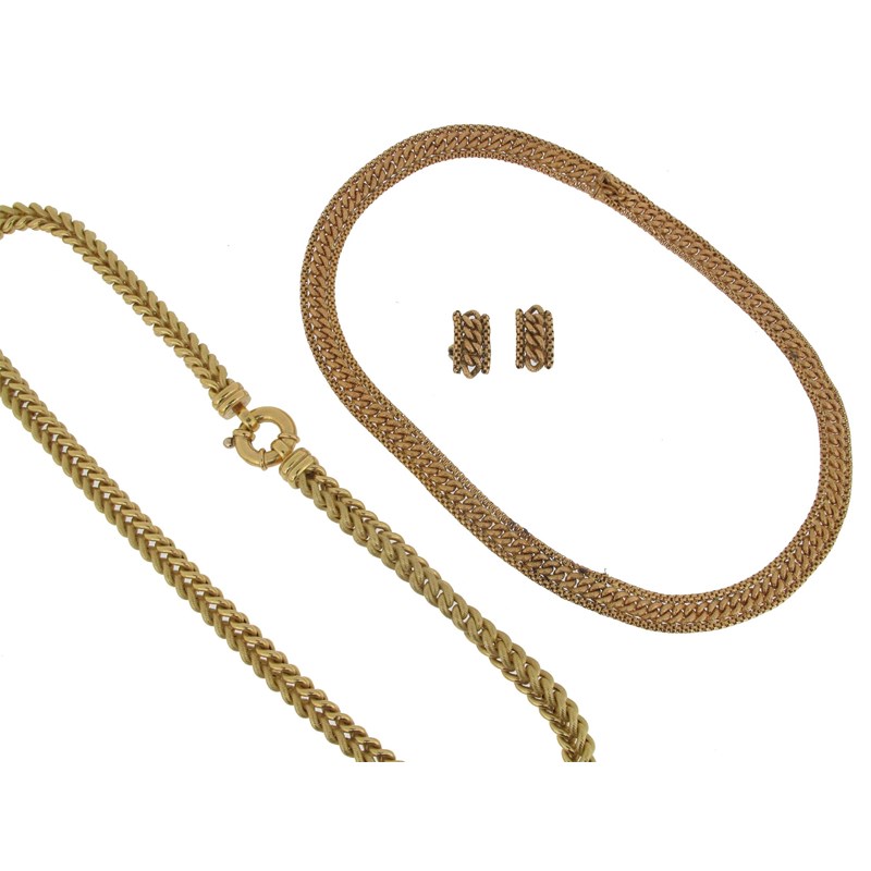 A yellow gold necklace of square plaited form, a flat curb link necklace with matching earrings, 70g in total.