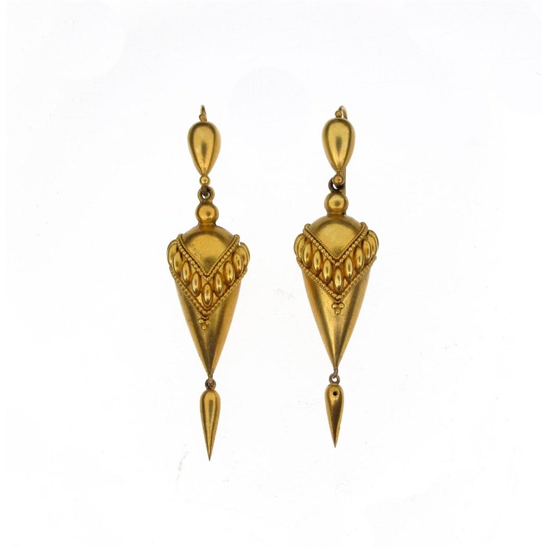 A pair of Victorian gold Etruscan style drop earrings.