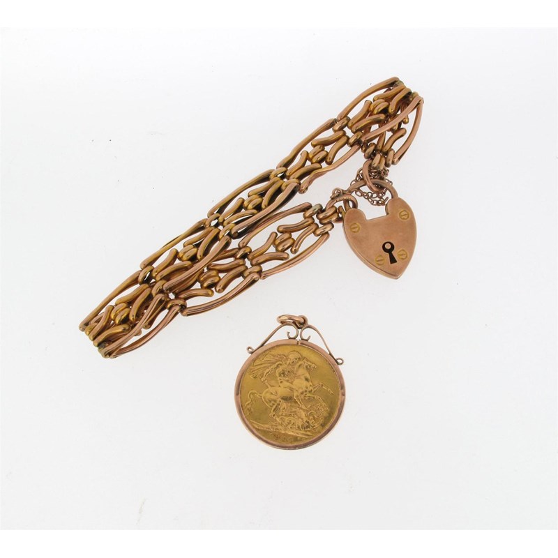 A gold fancy gate link bracelet with a gold padlock clasp, with a sovereign pendant mounted in a gold frame. 23g.