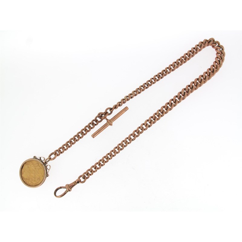A 9ct gold graduted curb link watch chain with a sovereign mounted gold pendant. 37cm. 55g in total.