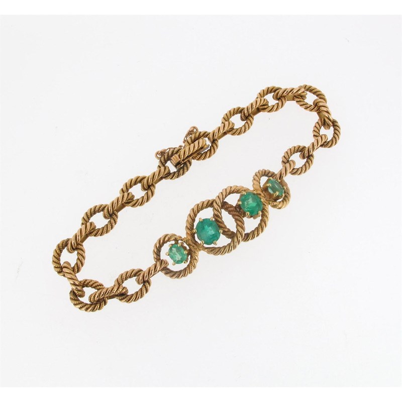 A gold twisted rope design bracelet, set with four graduated oval shaped emeralds, 24g in total.