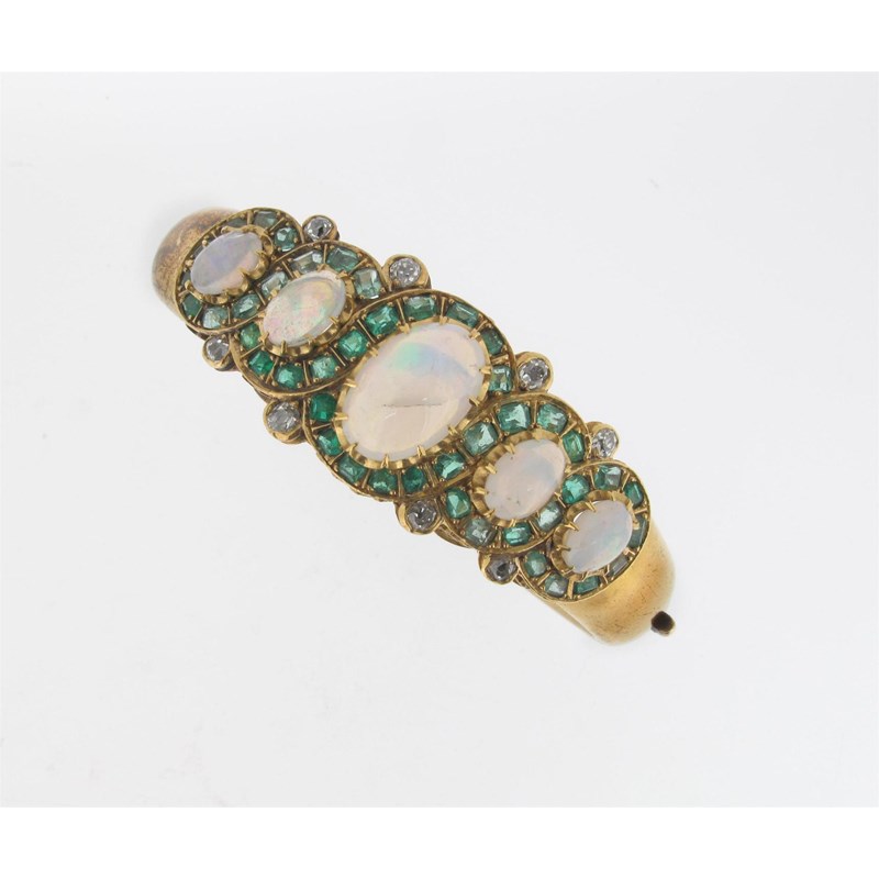 A Victorian opal, emerald and diamond cluster hinged bangle. Set with five oval shaped opals within emerald borders and a further eight small diamonds in gold.