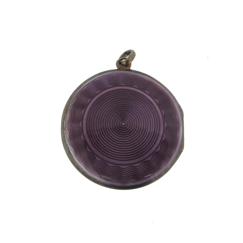 A circular silver hinged locket pendant, with purple guilloche enamel decoration both sides and opening to reveal two locket pendants. 3cm wide.