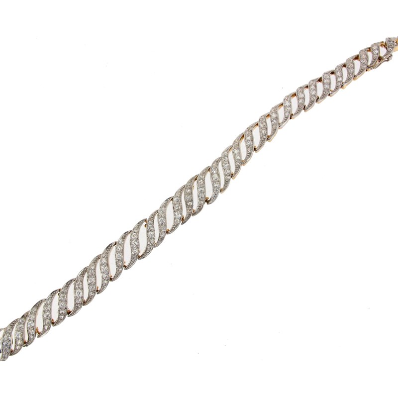 A diamond bracelet, the scroll links are each set with graduated circular cut diamonds in gold. 17cm.