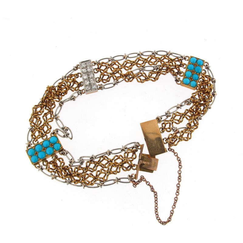 A fine platinum and gold link bracelet, with two rectangular sections set with turquoise cabochons and a rectangular section set with diamonds.