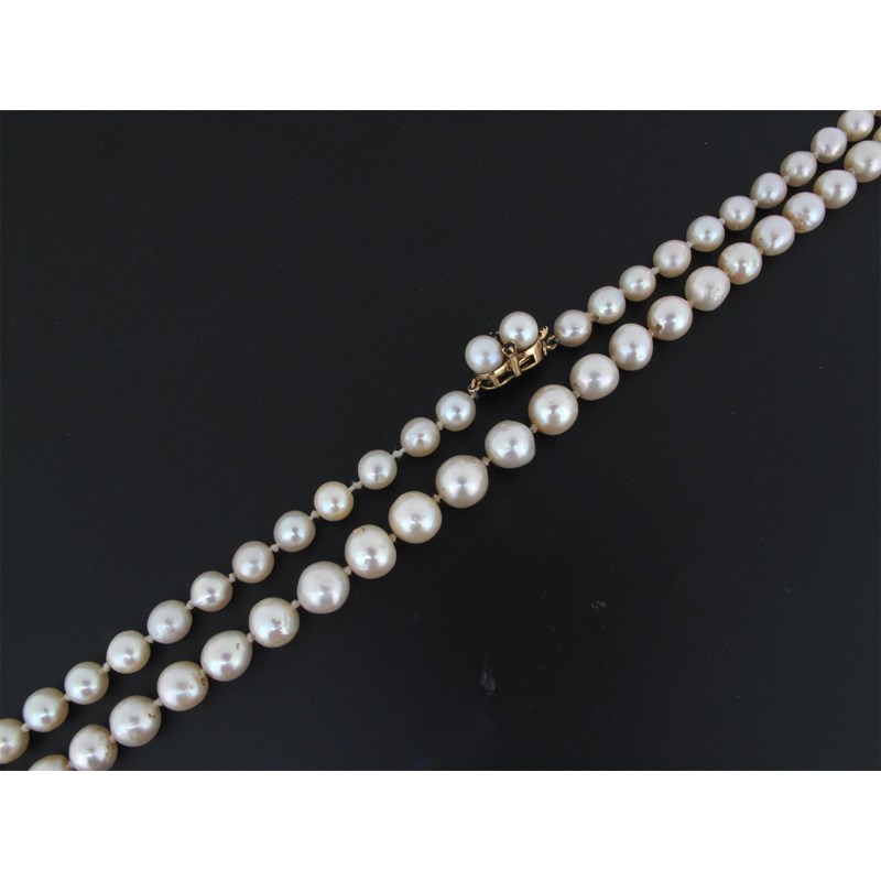 A single row slightly graduated cultured pearl necklace, the gold clasp set with two cultured pearls and two small sapphires. 82cm.