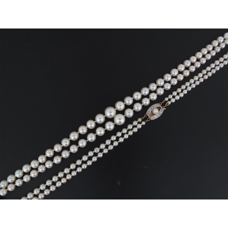 A two row graduated cultured pearl necklace, the pearls graduate from 2.9 to 8.1mm. The gold clasp set with diamonds and a smaller cultured pearl.