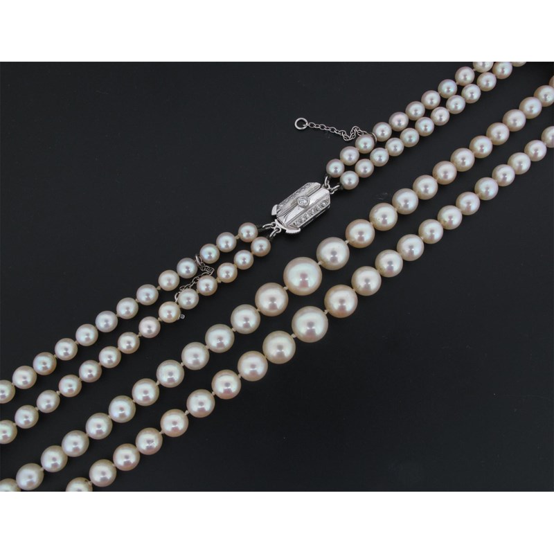 A two row choker length graduated cultured pearl necklace, the pearls graduate from 4.5 to 8.5mm. White gold clasp set with small diamonds.