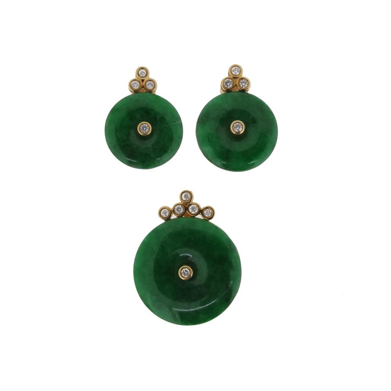 A jade disc mounted gold pendant, set with five diamonds. With matching jade and diamond set gold earrings. The pendant 2.2cm wide.