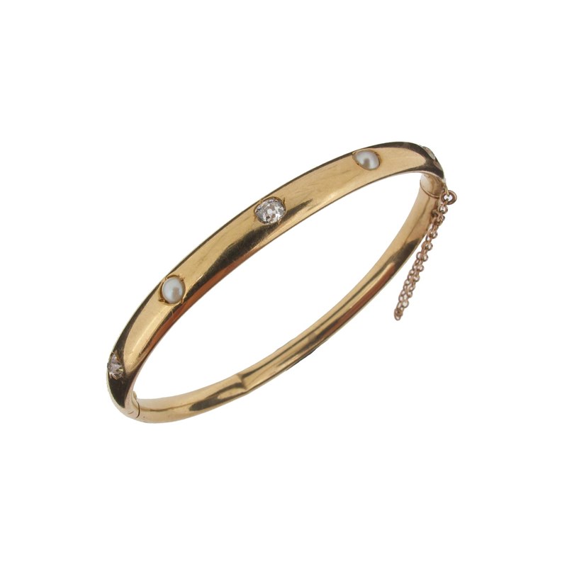 A gold hinged bangle set with three diamonds and two pearls, 14g.