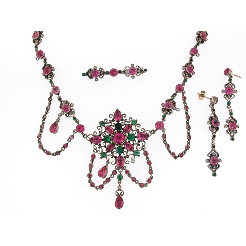 A necklace set with foil backed pink and green paste stones with matching earrings and bar brooch