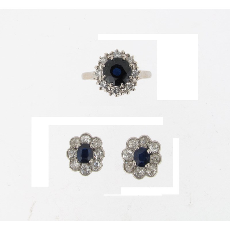 A sapphire and diamond set 18ct white gold cluster ring, with a pair of sapphire and diamond set cluster ear studs. Case.