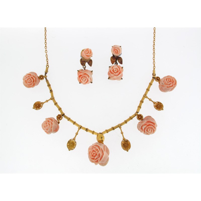 A 19th Century Etruscan style gold necklace, with graduated stylized flower head drops and applied with carved pink rose pendants. With matching earrings.