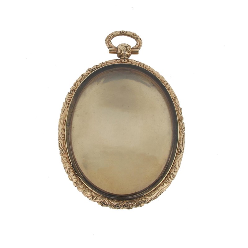 A Regency gold glazed locket pendant, with heavily foliate scroll carved border and hinged reverse opening decorated with engine turned pattern and centred with a vacant cartouche. The glazed locket section 4cm wide by 5cm high.