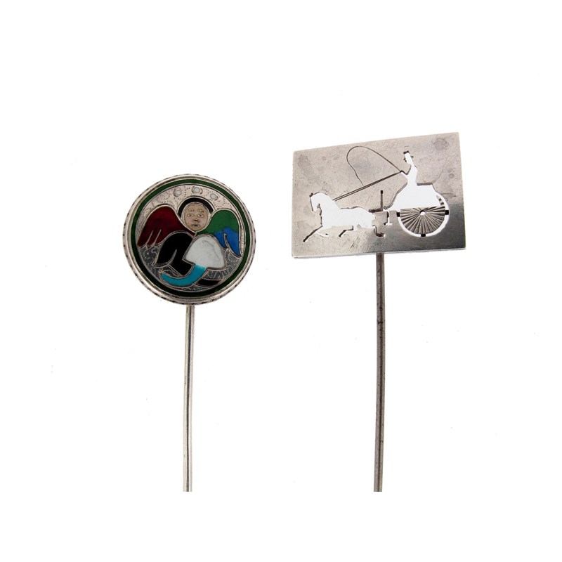 A silver stick pin, pierced with the silhouette of a horse and trap and another silver stick pin with stylized Byzantine angel decorated with enamel.