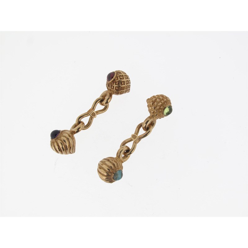 A pair of 9ct gold cuff links, set with cabochon stones. Fitted case.