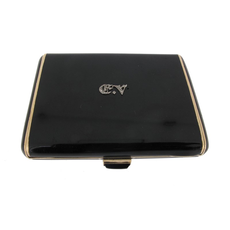 A small rectangular silver gilt minaudiere with black enamel decoration overall, the hinged cover applied with diamond set initials. Black onyx thumb piece. 7cm wide.