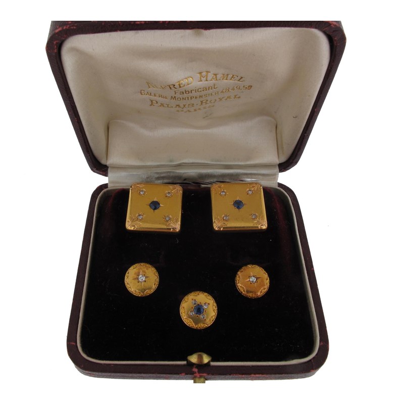 A cased pair of French cuff links and three dress studs. The cuff links of square form and centred with a sapphire and four foliate set rose cut diamonds. French control marks with similar studs. Fitted case by Alfred Hamel.
