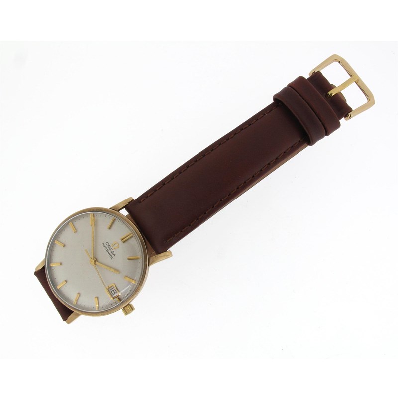 A 9ct gold wristwatch by Omega, signed dial with sweep seconds hand and date aperture, automatic movement. Leather band. 4cm including lugs.