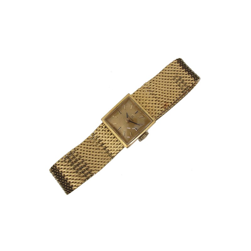 A lady's 18ct gold wristwatch by Omega, on an integrated yellow gold band. 34g in total.