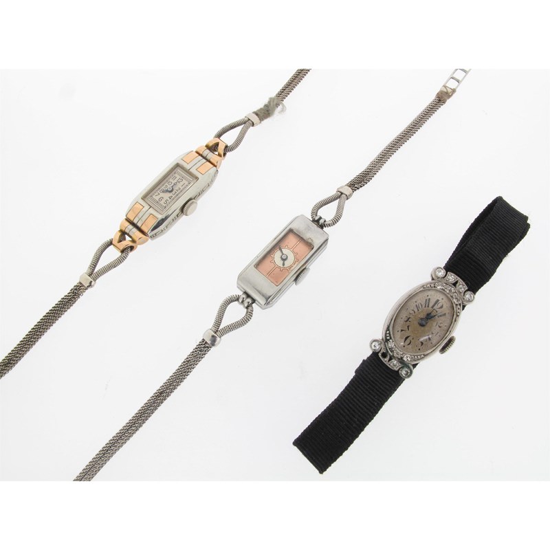 A lady's diamond set platinum wristwatch on a black silk band, an Art Deco lady's two colour 18ct gold dress wristwatch, the movement signed Dreadnaught. White gold mesh band (damaged) and a lady's white gold rectangular dress watch with pink gold dial.