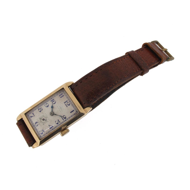 A rectangular 9ct gold wristwatch by Rotary, the silver dial with blue Arabic numerals and subsidiary seconds dial and signed Rotary maximus. Signed movement, case with import marks for Glasgow 1930, case number 468661.