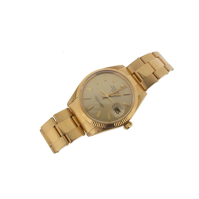 A gentleman's gold Oyster perpetual date wristwatch by Rolex, the signed dial with date aperture, centre seconds and on a gold Rolex band with deployant clasp. The dial 2.7cm.