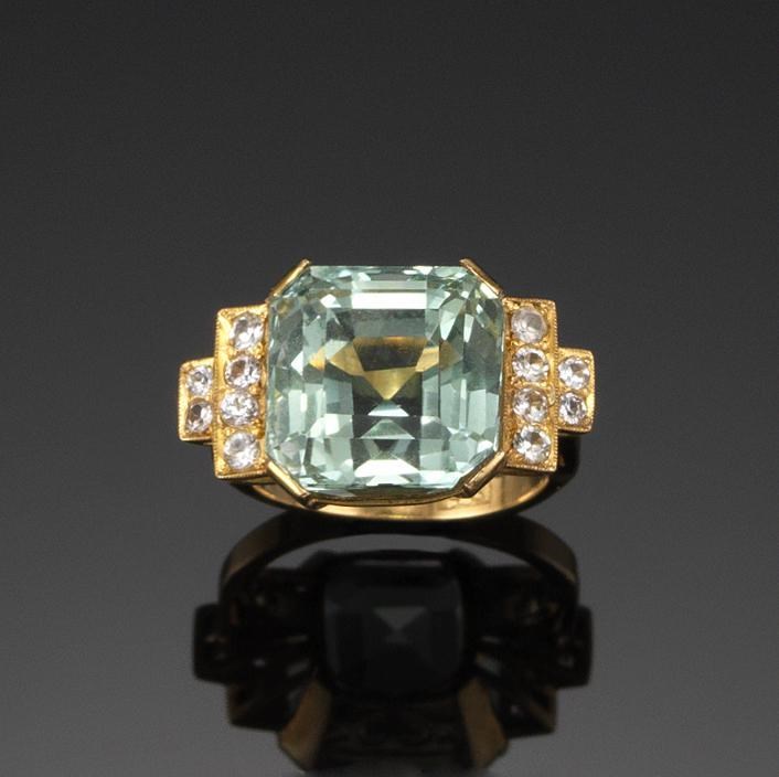 An aquamarine and white stone set gold ring, the square shaped aquamarine is set with six circular cut white stones to each shoulder. The aquamarine weighs 12.0cts, loose in the mount. Size L
