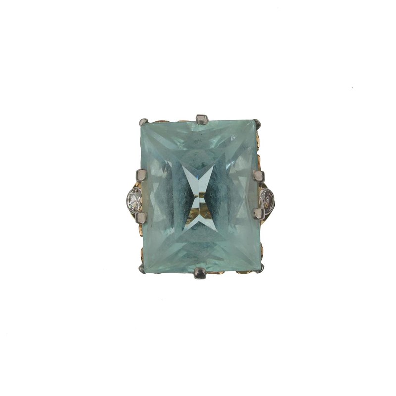 An aquamarine and diamond three stone ring, The large rectangular cut aquamarine is set in gold with two shoulder diamonds, size I.