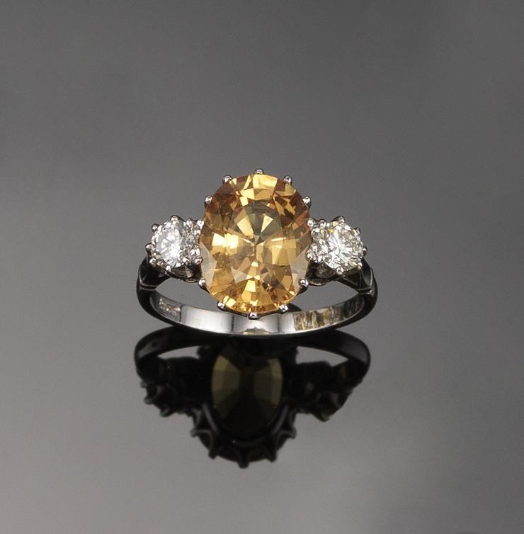 A yellow sapphire and diamond three stone ring, the oval shaped sapphire weighs approximately 5.50cts and is set with two brilliant cut diamonds in white gold. Size M 1/2.