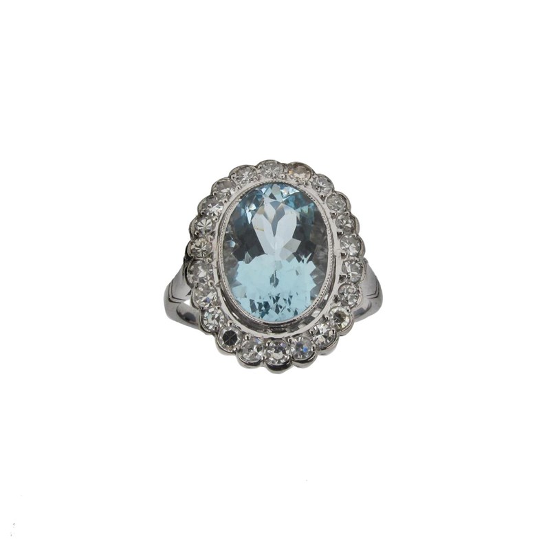 An aquamarine and diamond set cluster ring, the oval shaped aquamarine is set within a surround of circular cut diamonds in white gold. Size N.