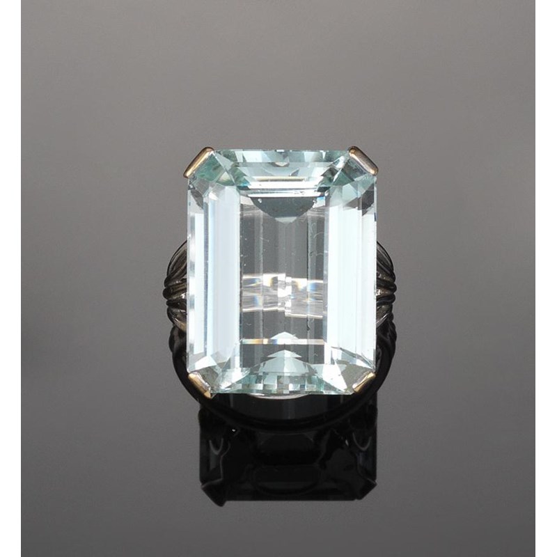 An aquamarine ring, the octagonal cut aquamarine is set in white gold. Size Q.