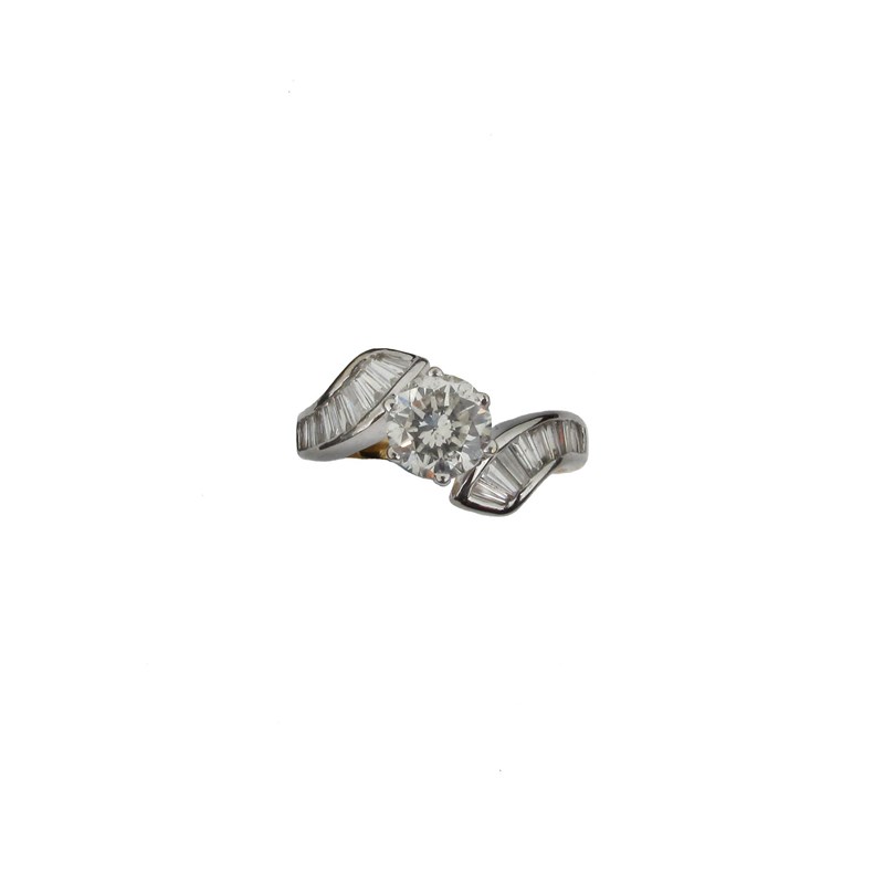 A diamond solitaire ring, the circular cut diamond is set with tapered baguette shaped diamonds to the shoulders in 18ct yellow and white gold gold. Size I.