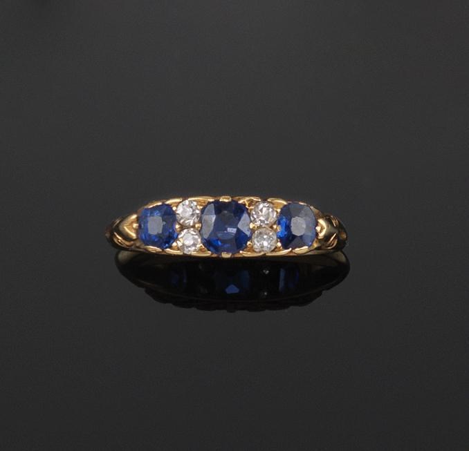 A sapphire and diamond seven stone ring, set with three oval shaped sapphires and four circular cut diamonds in 18ct gold, with carved shoulders, Chester marks for 1898, size N 1/2.