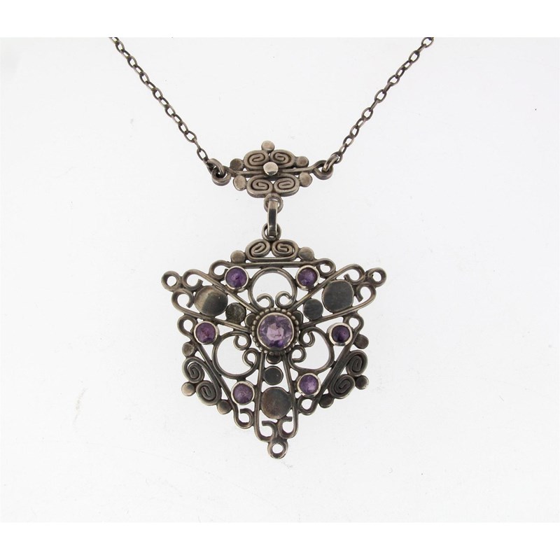 An amethyst Arts and Crafts silver pendant, marked WHH for Haseler Brothers. Fine link neck chain.